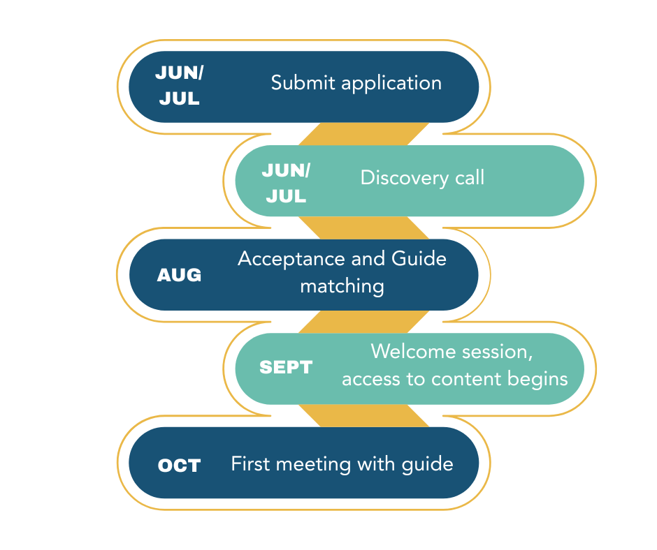 If accepted, you will receive an acceptance email and be paired with a Guide—your companion and accountability partner throughout the program.